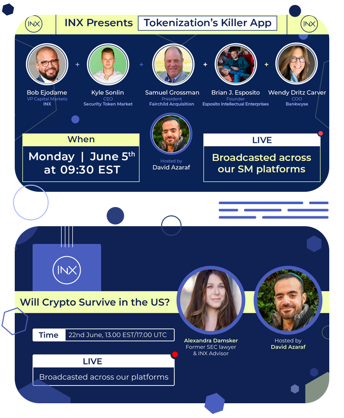 We hope you had the opportunity to join the multiple Twitter spaces and webinars we’ve hosted throughout June. Our webinars included lively discussions with market leaders who shared their knowledge and thoughts about the future of finance. Our Spaces varied from fascinating conversations with Twitter’s Wolf to the in-depth talks with Satoshi Club about INX’s trailblazing journey with the SEC to the launch of our new issuer HAG where we discussed the desired elements of this fresh offering on our platform.